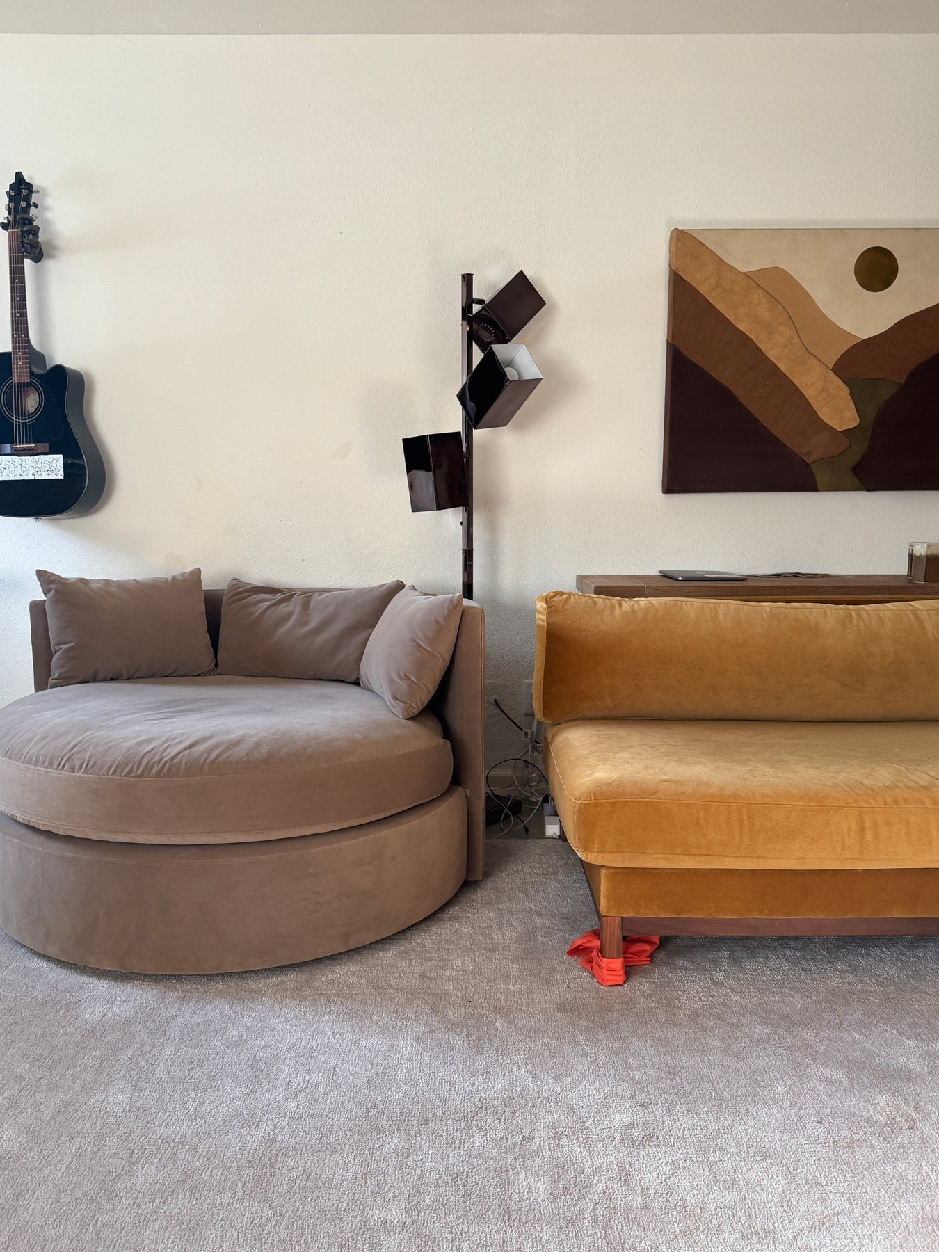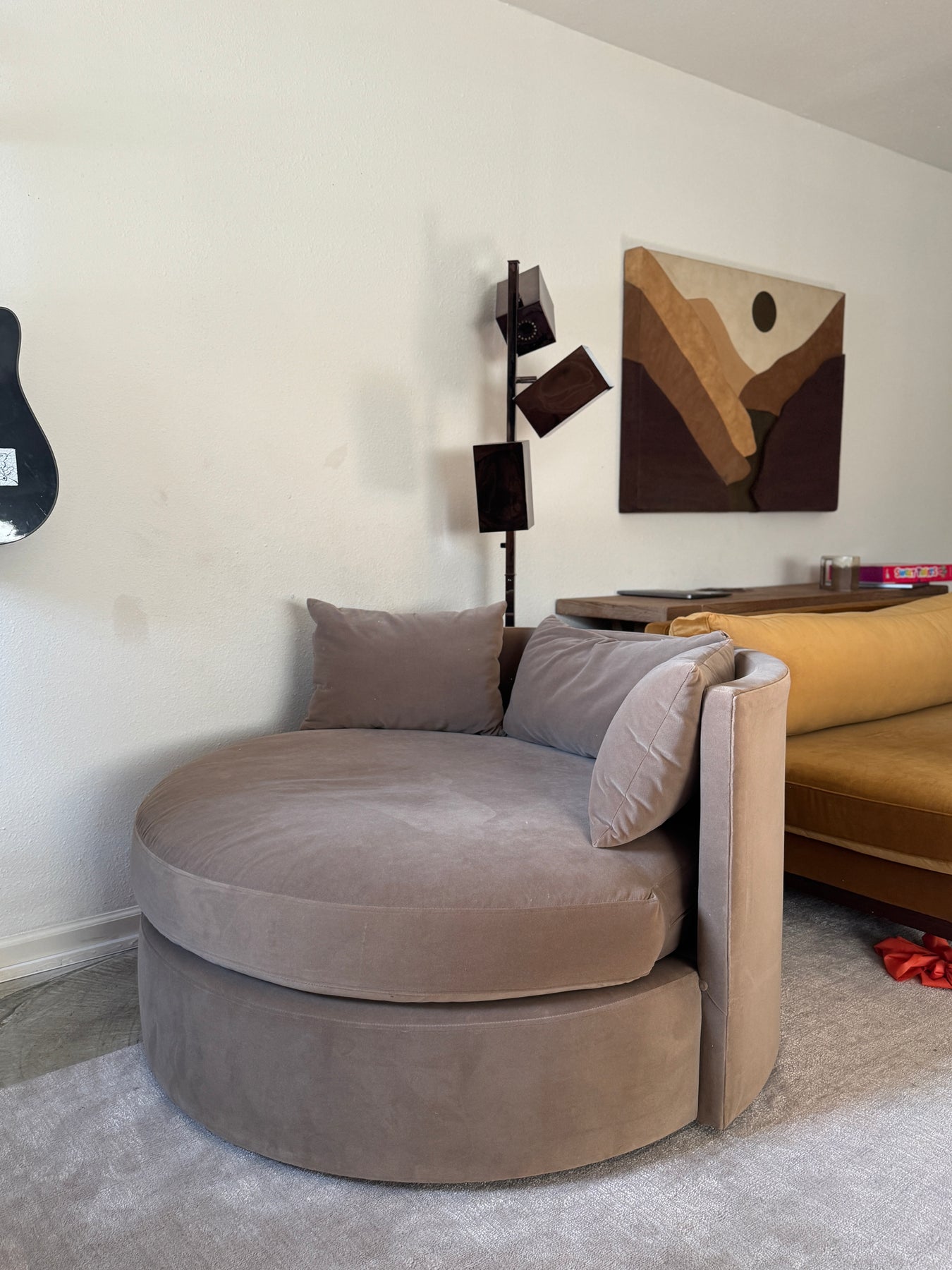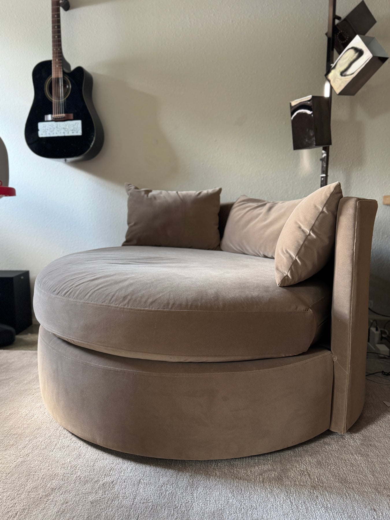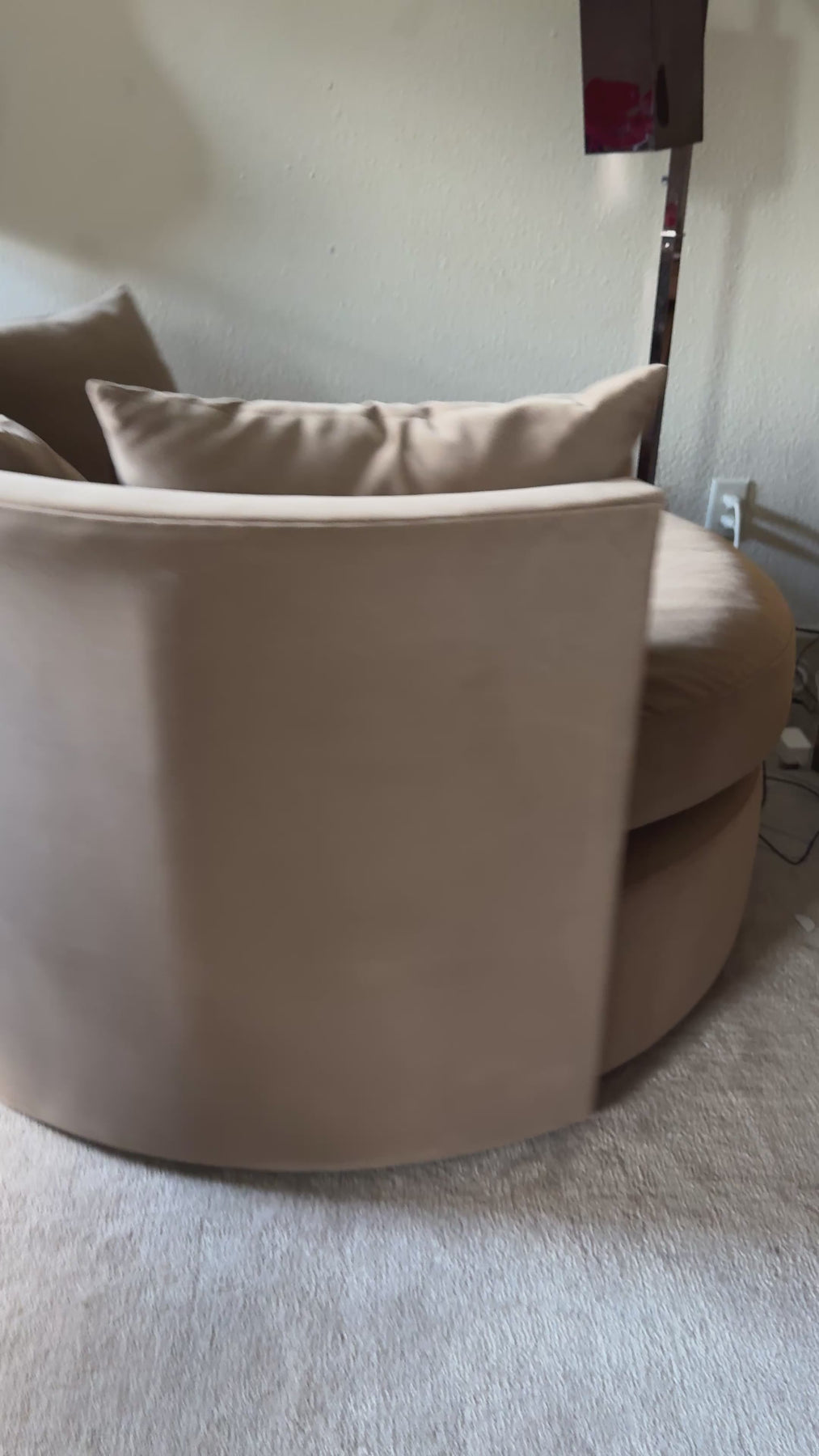 This is our beloved cozy swivel chair we've had in our home! Has been professionally cleaned in the last 6 months. I had this reupholstered in the last 2 years in a taupe performance velvet. In great condition as the performance velvet really does make it easy to keep clean! Review all photos. All sales final.